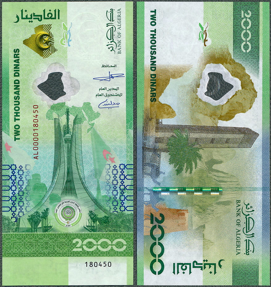Wydanie okolicznościowe z okazji szczytu Ligi Arabskiej w Algierze, w listopadzie 2022. Druk w technologii hybrydowej, łączącej papier i tworzywo sztuczne, banknot ma n.in. przezroczyste okienko.